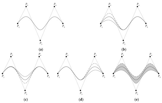 For instance, assuming that the whole shape of a curve can be defined by five control points (P1, …, P5), then three adjustable shape parameters and their value ranges can be calculated through Equations (1) and (2). Figure 1 depicts how these three shape parameters influenced the local shapes of the curve. Figure 2a shows the overall shape of the curve (in solid line) when all shape parameters were median values, i.e., (, , ) = (−1, 1.5, −1). When the first shape parameter was the maximum and the minimum of the range of values, and the other two parameters stayed at the median, i.e., (, , ) = (1, 1.5, −1) and (, , ) = (−3, 1.5, −1), then, in Figure 2b, the first wave of the curve displayed the highest (in the dash-dotted line), and the lowest (in dashed line), respectively, while the other two waves changed little. In Figure 2c, when the maximum and minimum values were given to the second parameter and the others were intermediate values, for (, , ) = (−1, 3, −1) in dash-dotted line, for (, , ) = (−1, 0, −1) in the dashed line, the second wave of the curve appeared from approaching the control point, P3, to far away from it, and the others remained stable. Similarly, in Figure 2d, only the third parameter was changed, with (, , ) = (−1, 1.5, 1) in the dash-dotted line, and (, , ) = (−1, 1.5, −3) in the dashed line. Then, the third wave of the curve went from high to low. In order to acquire the total range of shape adjustment for the curve within the value range of parameters, let (, , ) = (1, 0, 1) in the dash-dotted line and (, , ) = (−3, 3, −3) in the dashed line. The grey area in Figure 2e is the whole range of curve shape adjustment under these five control points.