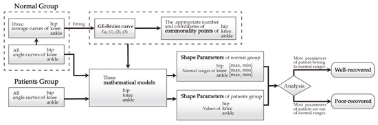 For the sake of illustrating the whole procedure clearly, the application process of expressing the differences of gait curves by the differences of shape parameters to make a distinction between normal and abnormal gait is shown in Figure 3. For the normal group, the three average gait curves of the participants were initially fitted by the GE-Bézier curve. The appropriate number and the coordinates of commonality points of each average curve was selected and calculated. Then, the mathematical model of each joint was established under the determined commonality points, and the normal ranges of shape parameters (values from maximum to minimum) were summarized through the models. For the patient group, the gait curves were directly fitted by the mathematical models derived from the normal group to calculate the shape parameters of each patient. Then, the shape parameters were analyzed to see whether they belong to the normal ranges. If most shape parameters of well-recovered patients belonged to this range, while most shape parameters of patients with poor recovery were beyond this range, this could indicate that this method can be used to assess rehabilitation status, so its validation is verified.