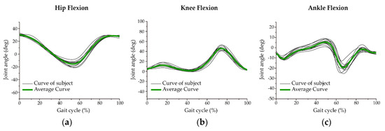 Figure 4 shows the flexion angle curves (black lines) and their average curves [42] (dark green lines) of the three lower limb joints on the sagittal plane in the normal group. From this figure, the distribution ranges of black lines and the dark green lines are equivalent to the grey area and the solid line in Figure 2e.