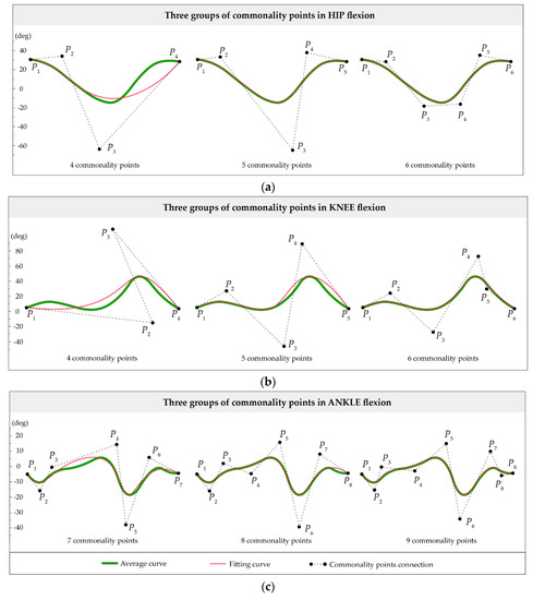 Therefore, the dark green lines, the three average curves, were applied to the fitting calculation of Equation (1), then the curve fitting results of different numbers of commonality points are shown in Figure 5 and Table 1. Specifically, Figure 5a displays three fitting conditions of four, five, and six commonality points according to the shape characteristics of the hip joint. After comparison, the goodness of fit in five and six commonality points were both 1 with a good fitting degree while the former had not only fewer points but also better correspondence of the numbers between shape parameters and waves than the latter. The average curve of the knee joint was best fitted when controlled by six points according to Table 1. Yet, the correspondence between three waves and four parameters was not clear enough. Although the fitting curve controlled by five commonality points did not fit the original curve completely (see Figure 5b), the proper reflection of the waveform property and the correspondence of three waves to three parameters still expressed the advantages. As for the average curve of the ankle joint, seven parameters exactly corresponded to seven fluctuations when controlled by nine points. Nevertheless, on the principle of minimizing parameters, smaller amplitudes that have little effects on gait feature analysis could be omitted for matching. Through the comparison of the first two fitting curves in Figure 5c, the goodness of fit and the parametric correspondence achieved better satisfaction when controlled by eight points.