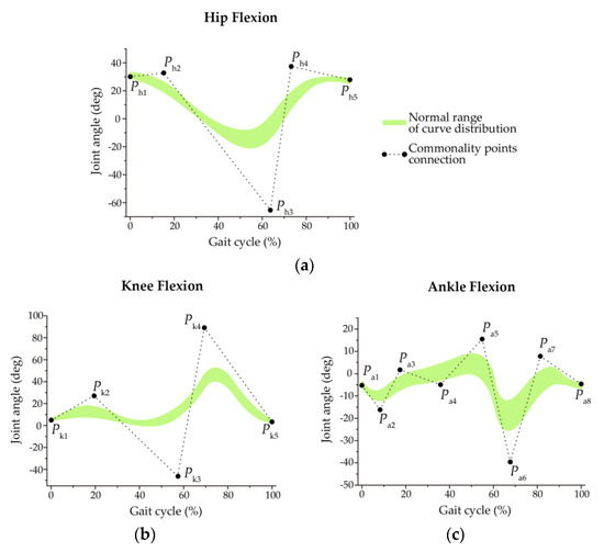 The determined commonality points and normal ranges of angle curves from the normal group after comparison of the fitting results: (a) Ph1, …, Ph5 connected by a dotted line are the five commonality points of hip joint, which means there were three shape parameters according to the model. The light green area shows the shape distribution of 10 curves and as the hip normal distribution range; (b) There were also five commonality points (Pk1, …, Pk5) and three shape parameters of knee joint curves in one gait cycle; (c) The ankle joint curves were provided with eight commonality (Pa1, …, Pa5) points and six shape parameters.