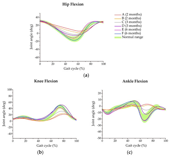 The angle curves of patients in three different rehabilitation periods and the comparison with normal ranges: (a) The hip flexion curves of the patient group during one gait cycle; (b) The trend of knee joint angle curves of patients was approximately similar to that of the normal range; (c) Patients A and B showed significant differences in their ankle curves from the normal range compared with other patients.