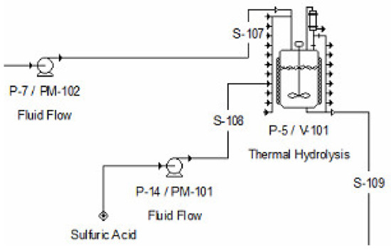 Before the cellulose and hemicellulose can be converted into hexose and pentose sugars, the lignocellulosic biomass must be pretreated to expose the polysaccharide. The biomass was mixed with sulfuric acid in a vessel, where thermal hydrolysis occurred. During thermal hydrolysis, the cellulose is converted to glucose, and the hemicellulose is converted to xylose according to Equations (1) and (2):