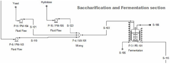 Process flow diagram of saccharification and fermentation section modelled in SuperPro Designer.