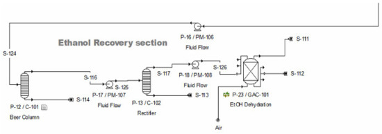 Process flow diagram of ethanol recovery section modelled in SuperPro Designer.