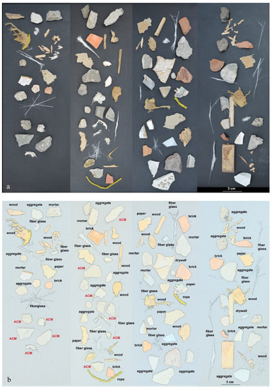 ACM samples containing asbestos, provided by VERAM s.r.l. (Rome, Italy) and characterized in previous works [11], were mixed with fragments of commonly utilized construction materials (i.e., fiber glass, wood, mortars, aggregate, rope, brick, paper) in order to create a “reference” laboratory-scale C&DW (Figure 1). ACM samples, containing amosite (Mg,Fe)7Si8O22(OH)2, chrysotile Mg3Si2O5(OH)4 and crocidolite Na2Fe2 + 3Fe3 + 2Si8O22(OH)2 fibers of different diameters and lengths were selected.