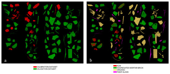 Hypercube image as resulting after mosaicking and samples individuals splitting in two data sets one to be utilized for calibration and the other for their validation (a). Four classes have been defined inside the data set (b). The class asbestos is referred to ACM individuals.