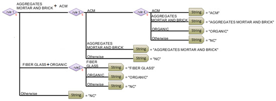 Rules 1 and 2 have adopted in order to perform a separation among the classes (AGGREGATES MORTAR AND BRIC + ACM) and the classes (FIBER GLASS + ORGANIC). Rules 3 and 4 allowed to perform a further two steps classification allowing to preliminary detect ACM and AGGREGATES MORTAR AND BRICK and a further “refining” allowing the identification, inside the previously recognized ACM class, of AGGREGATES MORTAR AND BRICK and ORGANIC, erroneously attributes (i.e., “false positives2) to ACM class in rule 3. Error probably due to the lower size distribution of some AGGREGATES MORTAR AND BRICK and ORGANIC particles, in respect of those correctly identified. The adopted and applied preprocessing strategy were summarized in Table 1.