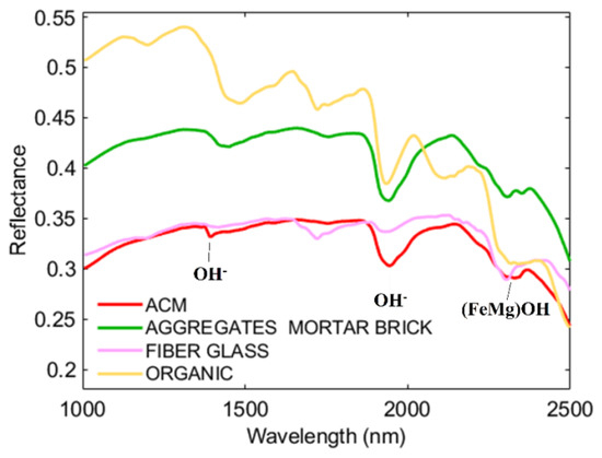 The two subsets were utilized to perform calibration and validation, respectively. To optimize the identification of the asbestos in ACM, the dataset has been divided into four classes (i.e., asbestos, aggregates/mortar and brick, organic, fiberglass), as shown in Figure 2b. Classes have been selected according to spectra differences as resulting from PCA results as evidenced by PCA results [11]. The mean spectra of the selected classes (Figure 4) show the vibrational spectroscopic effects in the wavelength ranges of 1380–1400 nm (1st OH overtone) and 2320–2340 nm (Fe-OH and Mg-OH combination band), indicating the presence in the sample/s of asbestos fibers [11,12,13,14,15,16,17,18,19,20].