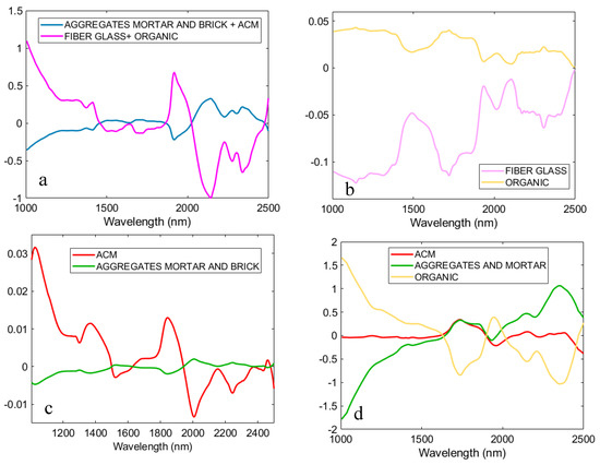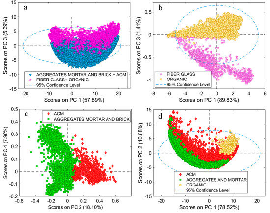 In detail, for the calibration dataset, samples containing asbestos fibers (i.e., crocidolite chrysotile and amosite) from the certified samples were chosen. Organic, aggregates, mortars bricks and glass fibers samples were also chosen so that to generate four classes characterized by a comparable amount of pixels. Through an exploratory analysis in PCA the best preprocessing procedures, according with those more utilized to handle NIR spectra [46,47,48], allowing the separation between the classes have been chosen. Finally four PLS-DA models have been created to perform discriminations: