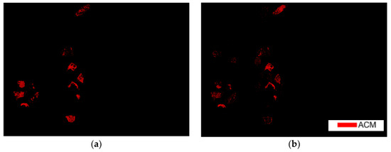 The comparison of Figure 8a,b shows how the ACM samples are all identifiable. The presence of false positives in general is low and in any case there is a clear difference in terms of the ACM predicted pixels and the pixels incorrectly assigned to the particles representative of not contaminated samples. The analysis of Figure 8c clearly shows as the unclassified pixels are due to the “border effect” present in all the analyzed samples and to the class NC (i.e., not classified individuals), that a class of material not containing asbestos (i.e., drywall) but, at the same time, not belonging, for their detected spectral attributes, to any of the previously defined classes, that is: AGGREGATES MORTAR AND BRICK, FIBER GLASS and ORGANIC. Although the obtained result does not negatively affect ACM identification, they also highlights how low spectral resolution generates more noise in prediction than that produced according to different set up adopted in our previous studies [20,36,39]. Increasing the number of the acquired samples, the noise effect will be reduced, thanks to the increase of spectral data set representative of each class.