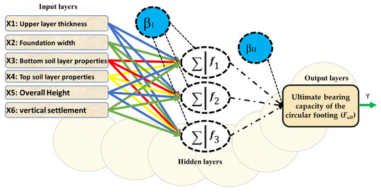 Recently, artificial neural network (ANN) has been suggested to support the estimation of ultimate bearing capacity of the circular footing in single homogenous soil environments as well as other engineering materials [1,2,3,4]. The study of Fult (maximum applied stresses corresponding to a particular settlement, i.e., 0.10 foundation width) of foundations is essential to geotechnical engineering and soil mechanics. In addition, complex geological structure, e.g., bearing capacity of shallow footings lied on multilayer soil (or non-homogeneous soil), are important to be considered. Traditional approaches are based on complex solutions, i.e., utilizing limit equilibrium consideration [5,6,7,8,9] or extensive experimental approaches [10,11,12,13,14]. In many cases, the suggested solutions illustrated how the top layer thickness (or its ratio to the footing width) affects the Fult of the shallow footing placed on two or more layered soils. In this regard, the settlement and bearing capacity of shallow footings have been proven to depend on several key factors, namely foundation soil parameters, the shape of the footing, and number of soil layer beneath the footing. The complexity of the problem is raised by the addition of soil layers under the footing. Different equations have been proposed to compute the soil bearing capacity (e.g., in a particular settlement) of circular and square footings [15,16,17]. The main problem of predicting the ultimate bearing capacity of the circular footing is to reduce or minimize its likelihood of high settlement after real stresses are used. The most effective parameters in predicting a correction amount for the bearing capacity are (i) soil parameters (or layered soils beneath footing), (ii) footing shape (e.g., strip, circular, and rectangular); and (iii) soil layers arrangement [18]. It is important to note that the soil properties (e.g., dilation angle, unit weight, internal friction angle and cohesion, and Poisson’s ratio, as well as elastic modulus) can apply stresses on the footing. In general, the ultimate bearing capacity of the circular footing has been determined to be the ultimate applied stress in the case of the maximum ratio of settlement (footing settlement/footing width or S/B) that is 10% of the footing width [5,19,20]. There are many factors that can affect bearing capacity of the shallow footing like multilayer soil and geological conditions, failure model considered through the calculation, the stronger soil location (for example, the arrangement of soil layer), type of the soil, and footing width [21]. For providing a reliable prediction of the ultimate bearing capacity (Fult) for shallow footings placed on multi-layered soils, many scholars like Haghbin [22], Lotfizadeh and Kamalian [23], Meyerhof and Hanna [10], and Ahmadi and Kouchaki [24] suggested novel formulas.
