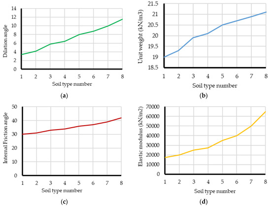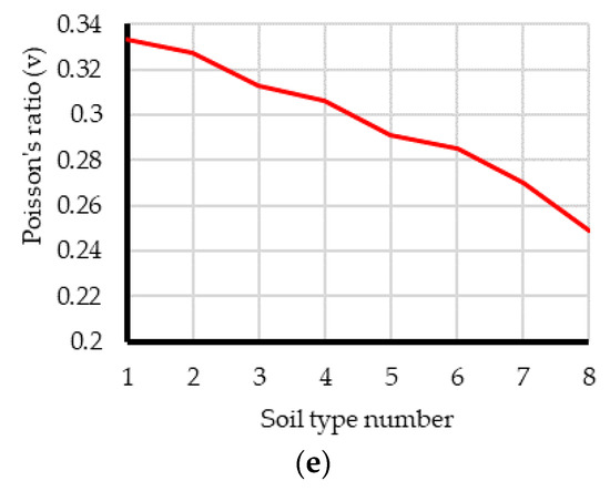 A summary of the range of input information vs. soil type, (a) Dilation angle, (b) Unit weight, (c), Internal friction angle, (d) Elastic modulus, (e) Poisson’s ratio
