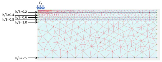 In this study, eight different soil types were used along with significant diversity in their main attributes. These attributes can address almost the most usual kinds of sands. In the modelling, internal friction and dilation angles in the range of 32–42 and 3.4–11.5 degrees are selected and also utilized, respectively. Moreover, the elastic modulus, Poisson’s ratio, and unit weight varied between the values of 17500–65000 kN/m2, 0.333–0.249, and 19–21.1 kN/m3, respectively. The soil properties, which are attended for prediction of a network can be shown as a series of the graphical summary that is the range of input data. These datasets include friction angle, Poisson’s ratio, elastic modulus, and unit weight is drawn in Figure 6. To determine applied stresses beneath the footing (Fult), asymmetric FEM of circular foundation, for example, a width around 1.0 m is placed on two-layer soils (Figure 7). Infeasible civil engineering plans, the layers of soil beneath the foundations are not homogeneous, commonly, and there are many cases where (i) a weaker soil layer rested on a stronger soil layer or (ii) stronger soil placed on a soil layer with much weaker physical characteristics. Plaxis 2D (a commercial finite element software) is employed to predict the influences of soil layer’s properties on ultimately applied stresses. Based on several recommendations (e.g., Mosallanezhad and Moayedi [50], and Hou, et al. [51]) the most effective factors, which influence the maximum bearing capacity of the soil, are (i) soil properties (for example, soil layer thickness beneath the footing), maximum expected settlement (s), friction angle , unit weight , elastic modulus E, Poisson’s ratio , type of design analysis, and dilation angle . (Table 1). Note that, in the present work, cohesion has been considered equal to zero for estimating the Fult in distinct layered sandy soils. In addition, zero value for cohesion means soil does not have any cohesive strength and provides sandy soil state. Values of 0, 0.4, 0.4, 0.8, and also 1.0 are selected for the upper layer width of thickness.