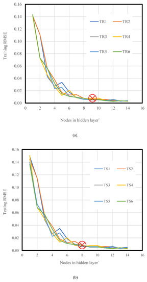 Variation of root mean square error (RMSE) vs. the number of nodes in the estimation of Fult., (a) Training RMSE, (b) Testing RMSE