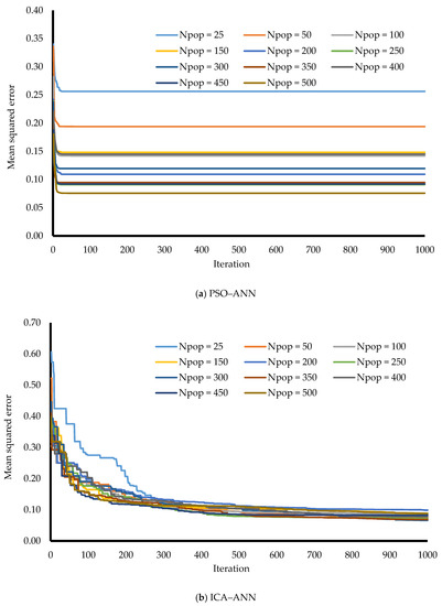 The results of network performance varied vs. population size for both of the ICA–ANN and PSO–ANN approaches are shown in Figure 11 and Figure 12, respectively.