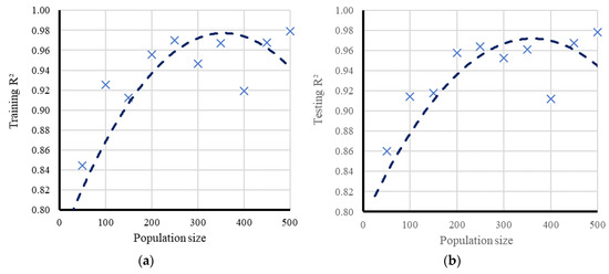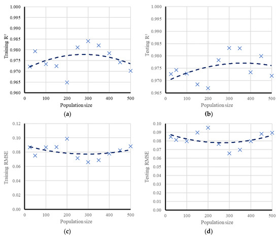 The results of network performance for the PSO–ANN vs. population size, (a) training R2, (b) testing R2, (c) training RMSE, (d) testing RMSE.