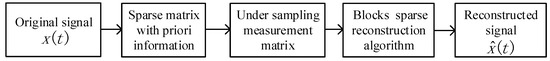 The basic idea of DUS-CS is that, in combination with the inherent characteristics of the signal, one can use the prior information sparse matrix [28,29] to represent the original signal. The signal can be represented by a complete prior atomic library and K-sparse coefficient vector. Then, according to the implementation method of direct under-sampling and the RIP (restricted isometry property) [30] condition of the measurement matrix to constructed measurement matrix, signal observation sampling can be performed to obtain under-sampling observation signals. Finally, based on the orthogonal matching pursuit method, combined with the block sparse property of the signal, it becomes possible to reconstruct the original signal (see flow diagram in Figure 1).