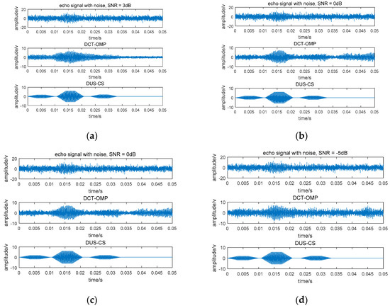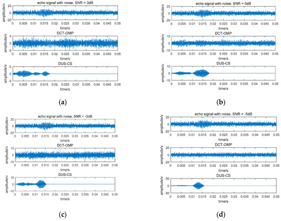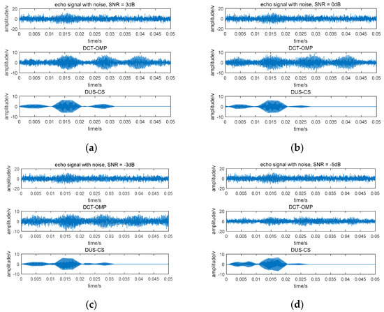 Generally, the probability density function of marine environmental noise obeys Gaussian distribution, so Gaussian noise is added in the generated signals with different signal-to-noise ratios (SNRs) to simulate marine environmental noise, and the under-sampling measurement matrix is used to compress the echo signals. Figure 3 shows the reconstruction of a signal when the compression ratio is 100% (no compression). Figure 4 and Figure 5 are reconstruction results when the compression ratio is 50% and 20%, respectively. In Figure 3, Figure 4 and Figure 5, DCT-OMP represents the combination of the discrete cosine transformation and orthogonal matching pursuit method and DUS-CS represents the direct under-sampling compressive sensing method presented in this paper.