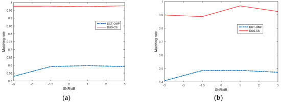 In which is the original signal, is the reconstruction result, and and , respectively, represent the absolute values of and . We give the variation of the matching rate with the signal-to-noise ratio when the compression ratio is 100% and 50%, respectively (Figure 6a,b). It can be seen that the DUS-CS method has obvious advantages. Therefore, the direct under-sampling structure can be used to observe underwater echo signals. The framework of compressive sensing can effectively recover the original signals, which confirms the correctness and effectiveness of the direct under-sampling observation method.