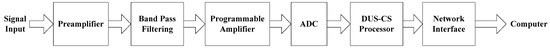 In the direct under-sampling system, the most vital component is data acquisition (DAQ) hardware. This is designed according to the receiving, collecting, and transmitting functions of the underwater acoustic signal. The hardware components include a preamplifier, band pass filtering, programmable amplifier, ADC (analog-to-digital conversion), the DUS-CS processor and the network interface (Figure 7). Figure 8 is an image of the signal collection card.