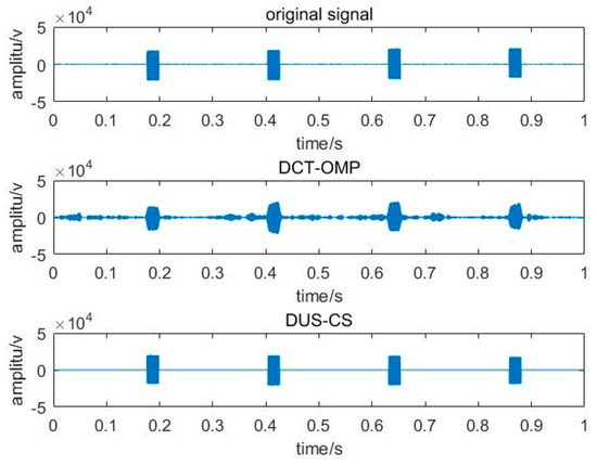 Firstly, the Nyquist sampling data is compressed, observed, and reconstructed to verify the correctness of the method. Figure 9 shows the Nyquist sampling data (sampling rate of 500 kHz) and the reconstruction results of the DCS-OMP method and the DUS-CS method.