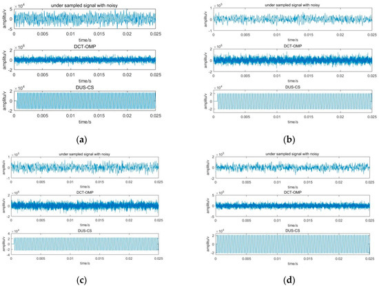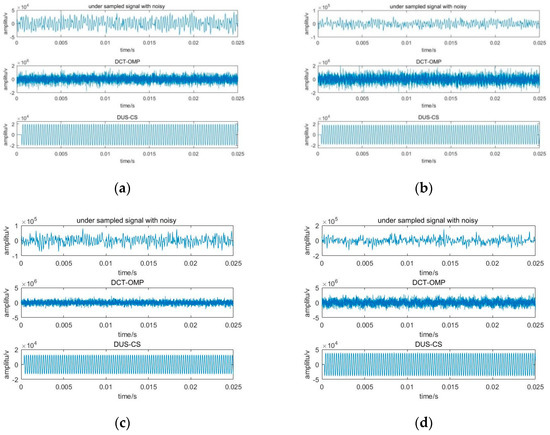 From Figure 3a, we can see that when the compression ratio is 100% and SNR = 3 dB, both methods can reconstruct the original signal with a noise reduction effect. When the signal-to-noise ratio is further reduced to 0 dB, the DCT-OMP method does not reconstruct the original signal as well as before, while the DUS-CS method still reconstructs the signal well. When the SNR continues to decrease, the DCT-OMP method can hardly reconstruct the original signal, but the DUS-CS method still performs well. The correctness and the engineering achievability of the under-sampled measurement matrix construction have been verified in Figure 3. Figure 4 and Figure 5 are the results of the two methods when the compression ratios are 50% and 20%, respectively. From the results, the DCT-OMP method is not ideal for signal reconstruction, but the DUS-CS method reconstructs the original signal well.