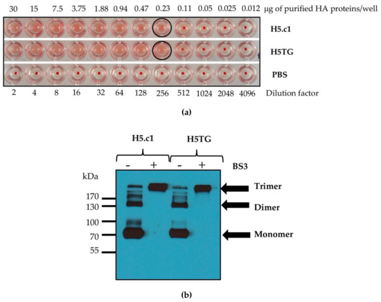 The trimeric HA exhibits epitopes that could induce neutralizing antibodies; therefore, it is important to retain the stable trimeric HA state [20]. In this study, the trimerization domain (GCN4–pII) was used to produce stable homotrimeric HA proteins. The multimeric states of IMAC-purified HA proteins were determined by cross-linking using BS3, a homobifunctional and water-soluble crosslinker [33,34]. In the previous study, the oligomeric status of H5 protein fused GCN4–pII was demonstrated by the cross-linking reaction with BS3, and the gel mobility of (H5pII)3 was approximately consistent with the expected size of a trimer [21]. Similarly, analysis by denaturing SDS–PAGE and Western blot indicated that the recombinant artificial H5.c1 and native H5TG proteins were observed as a mixture of multimeric protein without BS3 (as shown in Figure 4b, lanes 1, 3) and only trimeric proteins with BS3 (as shown in Figure 4, lanes 2, 4). These results were also similar to the study of Weldon and colleagues. This result indicated that the modification of the HA proteins at the C-terminus with the GCN4–pII motif stabilized the trimeric structure of the secreted recombinant HA protein [19].