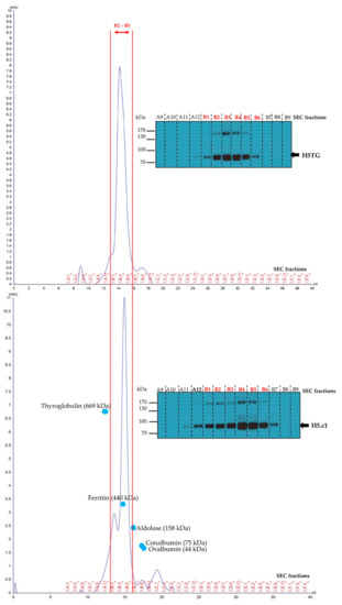 The results were obtained when characterizing the structure of IMAC-purified artificial H5.c1 and native H5TG proteins by SEC, as shown in Figure 5. The HA proteins presented from A11 to B7 fractions, in which most of the HA proteins eluted in the B1 to B6 fractions, which were fractions containing standard proteins with high molecular weights (160–500 kDa). This result indicated that most of the purified H5 proteins were oligomeric. The purified oligomeric H5 proteins from the B1 to B6 fractions were collected and then used for ELISA and Western blotting to detect HA-specific IgG mouse antibody production. The purity of collected fractions were confirmed by SDS–PAGE and Coomassie stain (Figure S2).