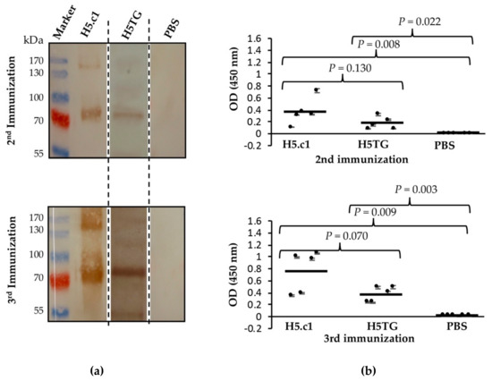 Immunogenicity of the artificial H5.c1 protein and native H5TG was tested by immunization of mice. Five BALB/c mice from each group were immunized with IMAC-purified artificial H5.c1 protein (group 1), IMAC-purified native H5TG protein (group 2), or PBS, as a negative control (group 3). The resulting antibody-dependent humoral immune responses against the SEC-purified HA proteins were first evaluated by SDS–PAGE and Western blot (Figure 6a). Five mouse sera collected after the second and third immunizations of each group (artificial H5.c1 protein, native H5TG and PBS) were mixed and used as a primary antibody. Specific IgG antibodies against SEC-purified HA proteins were detected following the second and the third immunizations. After the third immunization, a much stronger band signal was clearly visible compared to that following the second immunization in both the artificial H5.c1 and native H5TG groups. The band signal of the artificial H5.c1 group was significantly stronger than that of the native H5TG group following the second immunization. In the negative control mice group vaccinated with PBS, there was no HA-specific IgG antibody response induced.