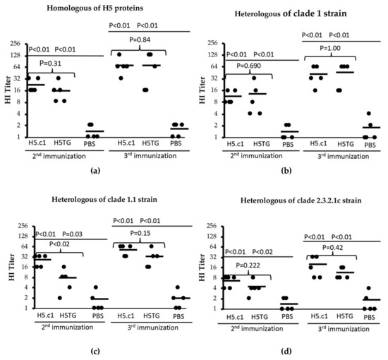 Haemagglutinin inhibition (HI) titres against homologous HA proteins (a) and heterologous strains (A/Vietnam/1194/2004(H5N1) – clade 1 (b), A/duck/Vietnam/ST0970/2009(H5N1) - clade 1.1 (c) and A/duck/Vietnam/HT2/2014(H5N1) - clade 2.3.2.1c (d)).