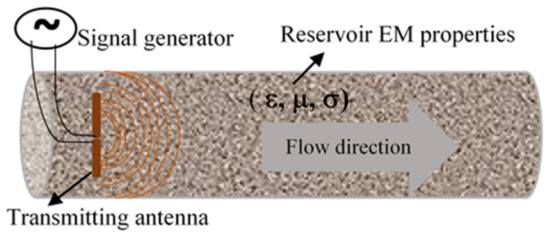 where μr is the relative permeability, E is the electric field vector, k0 is the wavenumber in free space, εr is the relative permittivity, ω is the angular frequency, σ is conductivity and ε0 is the permittivity of free space. Thus, the phasor is represented as , where r is the propagation distance, γ (m−1) is the propagation constant, which is a complex quantity of the form , where the real part α (Np/m) is the attenuation factor and the imaginary part β (rad/m) is the phase constant. Generally, oil reservoirs are a low-loss medium, that is . Hence, the irradiated EM waves are absorbed and attenuated as they propagate and spread within the medium [6,32]. Therefore, the attenuation factor α and phase constant β becomes: