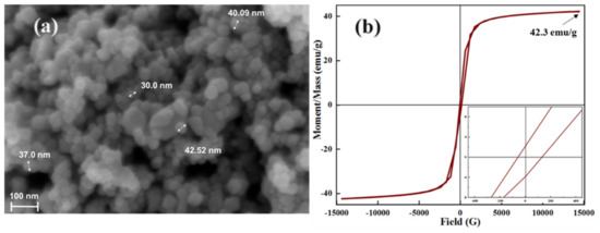 The FESEM image of the Fe3O4 nanoparticle used to prepare the magnetite nanofluid for saturating the core rock sample is shown in Figure 4a. The FESEM image shows that the nanoparticles have a spherical shape and an average particle diameter of 36 nm. The spherical shape of the nanoparticles combined with its small particle size is beneficial for enhancing oil recovery [38,39]. The nanoparticles will thus possess high mobility through pore throats and good adsorption of oil molecules and will easily detach oil molecules from the rock surface leading to an improved recovery factor. In contrast, the large particle size in the order of microns could solidify upon application of an external magnetic field and cause pore throat blockage [40]. Figure 4b displays the hysteresis curve of the magnetite nanoparticle, which has a saturation magnetization (Ms) of 42.3 emu/g and retentivity (Mr) of 3.0134 emu/g. The prepared Fe3O4 nanofluid has a DC conductivity of 2.19 S/m and dielectric permittivity of 74.2 at 600 MHz.