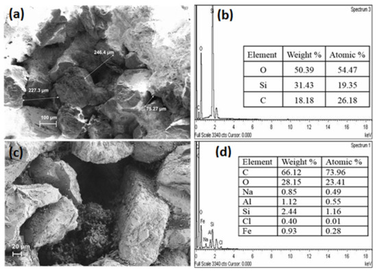 The elemental distribution of the pore space is indicated in Figure 5b by the EDS spectrum, which is comprised largely of silicon (31.43 wt%) of sandstone silica and oxygen (50.39 wt%) of connate water and carbon (18.18 wt%). Hence, a combination of the pore structure and elemental composition are important background knowledge, which can help determine the influence of the injected fluid content on EM wave propagation within the medium, as will be shown in subsequent sections. The presence of the injected crude oil and saturating nanofluid is confirmed in Figure 5d, which shows the EDS element distribution analysis within a pore space (Figure 5c) of the sandstone sample. A combination of the high carbon (C) content in the spectrum confirms the presence of the saturating crude oil, which is 61.16 wt% of the pore content. The presence of magnetite nanofluid is likewise confirmed by the Fe peak in the EDS spectrum and is relatively sparse (0.92 wt%) due to the small amount (0.05 wt%) of Fe3O4 nanoparticles dispersed in the NaCl used to prepare the nanofluid. This small concentration of nanoparticles was used to avoid nanoparticle retention within the porous structure, as this has been earlier reported [42].