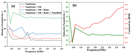 (a) Dielectric permittivity of the sandstone sample at different saturations and (b) permittivity and conductivity variation of the sample saturated with brine, oil and nanofluid.