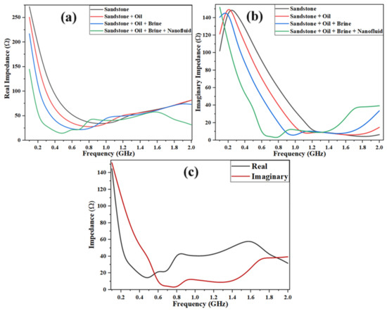 Input impedance of the antenna in sandstone medium at different saturations; (a) real impedance, (b) the imaginary part and (c) real and imaginary impedance in sandstone containing oil, brine and nanofluid.