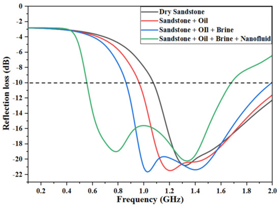 Figure 8 shows the simulated return loss of the antenna in four different media, dry sandstone, sandstone saturated with oil, sandstone saturated with oil and brine and sandstone saturated with oil, brine and nanofluid. The essence of analyzing the reflection loss peaks is to determine frequencies at which the least amount of input signal is reflected by the antenna in order to maximize energy delivery to reservoir materials for stimulation and recovery of trapped oil. The antenna has return loss < −10 dB in the range; between 1.09 GHz and extends over 2 GHz (0.91 GHz bandwidth), between 990 MHz and 2 GHz (1.01 GHz bandwidth), between 900 MHz and 2 GHz (1.1 GHz bandwidth), and between 580 MHz and 1.68 GHz (1.1 GHz bandwidth) within the aforementioned four scenarios, respectively. The curve indicates that the antenna has a single reflection loss peak with a corresponding value of −20.708 dB at 1.3 GHz and −20.575 dB at 1.2 GHz for the dry sample and when saturated with oil, respectively. However, the antenna exhibits double reflection loss peaks in the sandstone containing oil and brine (−21.12 dB at 1.0 GHz and −21.37 dB at 1.4 GHz) and that containing oil, brine and magnetite nanofluid (−18.91 dB at 800 MHz and −20.00 dB at 1.3 GHz). The double reflection loss peaks of the antenna within these two media could be attributed to the electrical length of the antenna. The antenna approaches the limit of an electrically large antenna at the high-frequency peak (shorter wavelength of the propagated EM wave), and an electrically small antenna at the lower frequency peak corresponding to the longer propagating wavelength [46,47].