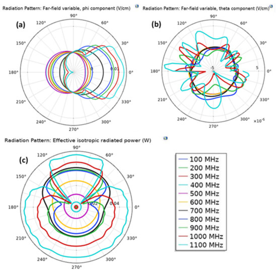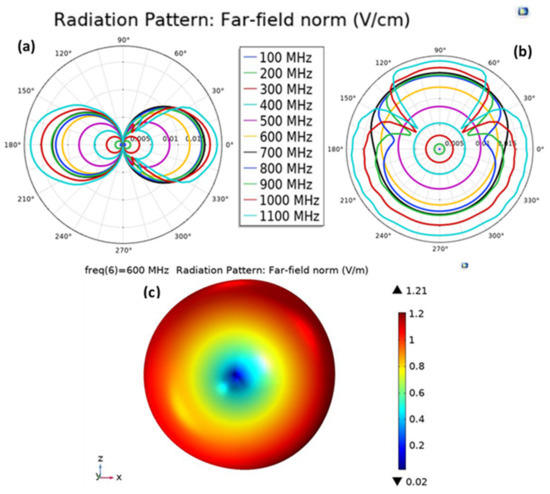 Figure 9 shows the simulated radiating pattern of the antenna. It can be seen from Figure 9a,b that the antenna becomes directional and beamforming with increasing frequencies (beyond 700 MHz) as indicated by the gradual appearance of side lobes. As a result, more propagation distance was covered in one direction. However, the angular coverage decreases, and the radiation pattern is non-uniform, implying an unequal distribution of the radiated energy. Therefore, the antenna should be operated at a frequency less than 800 MHz to achieve a uniform radiating field pattern, which is one of the major goals of downhole antenna design [28]. The radiation pattern was found to be uniform at 600 MHz, as shown by the omnidirectional pattern in Figure 9b, indicating that a roughly equal amount of power was radiated from all sides of the antenna. Interestingly, this coincides with the resonant frequency of the medium as earlier determined. Figure 9c shows a three-dimensional image of the far-field propagation pattern obtained at 600 MHz, indicating the E-field distribution around the antenna within the sandstone medium saturated with oil, brine and nanofluid.