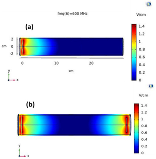 Figure 11a shows the antenna propagation within the modelled reservoir geometry. The figure gives a visual representation of E-field distribution within the medium. The EM wave attenuation phenomenon is likewise visible from the figure, where the field strength is maximum at the antenna surface, and gradually diminishing at a distance. The penetration depth at 600 MHz was computed as 5.7 cm. An alternate setup for increasing the EM propagation distance by using double transmitter placement is shown in Figure 11b.