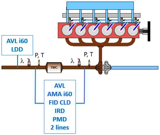 All pollutant emissions were measured by AVL i60 devices: THC and CH4 by a flame ionization detector (FID), NOx by a chemi-luminescence detector (CLD), CO and CO2 by an infrared detector (IRD), O2 by a paramagnetic detector (PMD), and NH3 by an AVL LDD standalone ammonia analyzer.