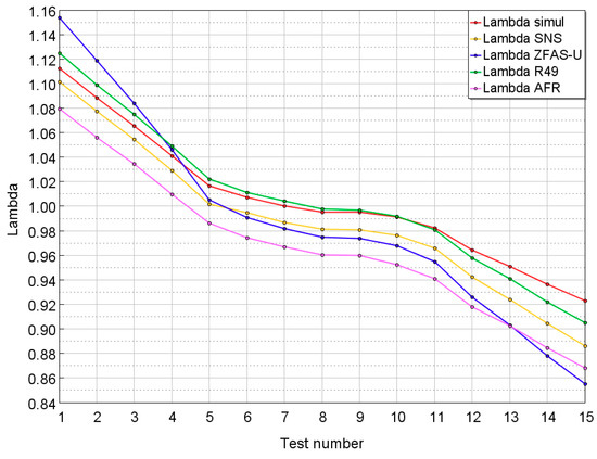 Comparison of λ values calculated with different formulations at 1900 RPM (100%) load. On the y-axis, the average value of λ is shown for each of the 15 conditions tested. In red: λ from GT-Suite; in yellow: measured λ from the Smart NOx Sensor (SNS); in blue: measured λ from the Universal Lambda Sensor (ZFAS-U); in green: λ derived from the R49 regulation; in pink: λ from air/fuel ratio and stoichiometric dosage.