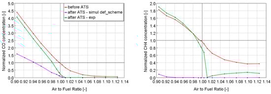 It is worth to mention that the residual oxygen concentration in exhaust gases, especially in stoichiometric and in rich conditions, represents a critical issue. Indeed, its concentration, measured by the analyzer, was approximately equal to 0.2%, even in the conditions at the lowest AFR. As a result, oxygen analyzer measurements turned out to be an important element for the simulation setup, influencing, as known, the oxidation/reduction of the pollutant species.