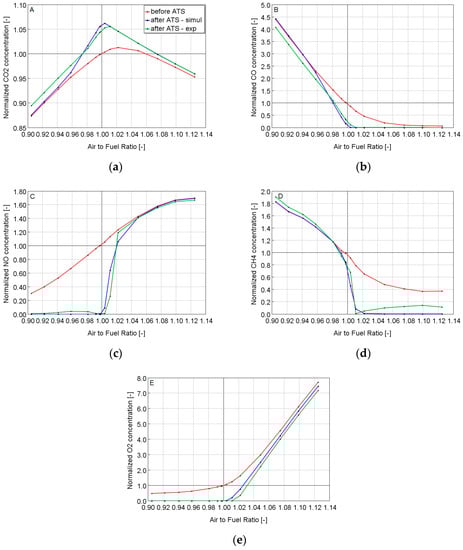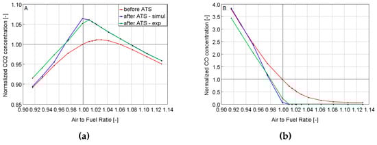 Figure 6a,b report the results for the full engine load, clearly indicating an adequate response of the model on carbon oxide conversion. It is possible to notice that the CO concentration was slightly underestimated around stoichiometric conditions and was overpredicted, as the mixture tended to have very rich values. Such behavior, correspondingly affecting CO2 conversion, was obtained in all the operating conditions, even at partial engine load. Nonetheless, it has to be specified that the discrepancies were contained, in all the cases, within a range of 0.2%, giving rise to a reasonably consistent agreement between numerical and experimental results.