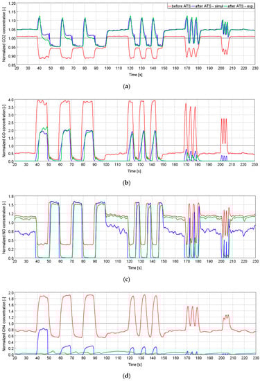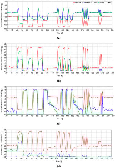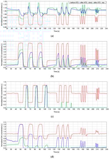 As an example, Figure 5 shows engine-out and tailpipe concentrations of some of the main converted species obtained through the default kinetic scheme [17]. For the sake of brevity, only the results of the most favorable conditions at high loads in SS were proposed. The wide deviations between the pink curve and the green curve are significant, demonstrating the inaccuracy of the starting model.