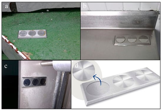 The SCH sensors were AISI 316 grade 2B stainless steel coupons (2 cm in diameter and 1 mm thick) coupled to a base through the action of neodymium magnets and coated with epoxy paint. These bases, which were also made of stainless steel, could hold three coupons simultaneously, thus facilitating their weekly analysis for three consecutive weeks. The supports were welded to the areas to be evaluated (Figure 1). This tool enabled the coupons to be in the same conditions as the rest of the surfaces in that area. The sensors were then subjected to the same contamination and cleaning/disinfection protocol as the surfaces to be sampled [], allowing the natural biofilms that may have formed on the surfaces to be analyzed. To this effect, Moen et al. indicated that stainless steel coupons are suitable for analyzing the natural microbiota of the surrounding environment and they have been used in different subsequent studies []. More concretely, a variation of just 5.1% on species richness between the sensors and the sinks (the real study material of their research) was demonstrated.