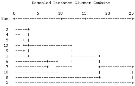 The relationship between the studied areas was determined by means of the similarity of the mesophilic aerobes profile. Following other authors such as Feligini et al., these locations were classified into clusters through a hierarchical clusters analysis []. In this case, the analysis of hierarchical conglomerates was the most appropriate approach since the number of clusters was not known a priori and the number of areas to be classified was small (eleven areas). Thus, the statistical program measured the proximity between two conglomerates by calculating the average of the distances between objects in the two groups. A matrix of proximity between the objects was generated from the Euclidean distances between all the sites. Last, the distances between clusters of sampled areas were represented by a dendrogram.