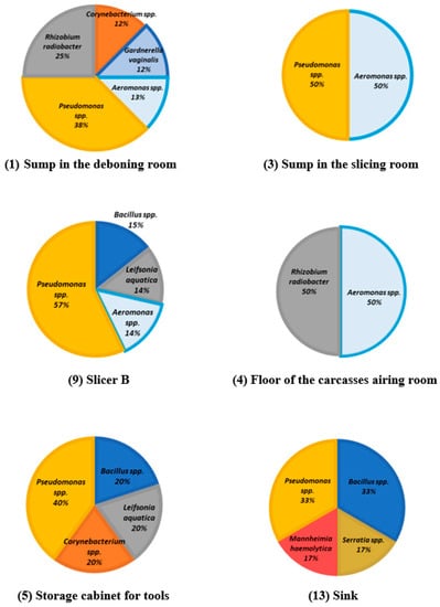 Like in the present study, Hoodt and Zottola identified the presence of Pseudomonas spp. and Aeromonas spp. in the sinks []. In other studies, Pseudomonas spp. [,], Enterobacteriaceae, and yeasts and molds have been found on knives, tables, and chopping machines []. Pseudomonas spp. is commonly found in soil and water where it plays an important role in the degradation of organic material. They are part of the normal microbiota of human skin and are found in the respiratory tract and intestines []. Aeromonas spp. is also ubiquitous, usually found in water sources, soil, arthropods, mollusks, mammals, birds, fish, and insects []. Corynebacterium spp., present in the sump in the deboning room and tools storage cabinet, also has a global distribution and is found in soils, water, animals, and plants, especially in temperate areas []. The less common Leifsonia aquatica, isolated from slicer B and the tool storage cabinet (Figure 3), could come from the water since it inhabits the aquatic environment. It is characterized by having a low growth rate and the capacity to form biofilms [].