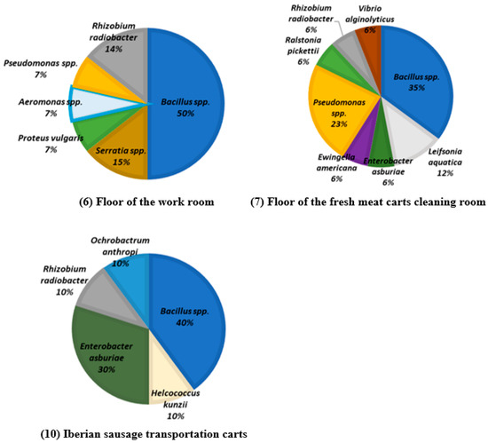 Ecological profiles could not be established in areas 11 (vacuum machine slide) and 12 (heat treatment room floor) (Table 1) due to the lack of growth on the PCA plates. In fact, in the quantitative study carried out by Ripolles-Avila et al. these two areas were described as the least microbiologically contaminated [].