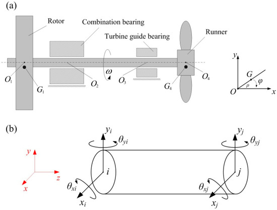 where xi, yi (i = 1,2,3,4) and θxi, θyi (i = 1,2,3,4) are the displacements of the rotor, combination bearing, turbine guide bearing, and runner in x and y directions and angles of orientation associated with the x and y axes, respectively.