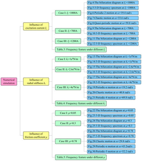In the previous section, the dynamics model of the rotor-bearing-runner system (RBRS) is introduced and the system dynamics equation is obtained. In this section, the influence of different system parameters on nonlinear systems under the coupling of mechanical unbalance force, nonlinear magnetic pull force, hydraulic unbalance force, and nonlinear rubbing force is studied, through Bifurcation diagram, 3-D frequency spectrum, Waveform, Frequency, Axis orbit, and Poincaré map. The parameters for the coupling system are presented in Table 1. In addition, the detailed simulation condition schematic is displayed in Figure 2.